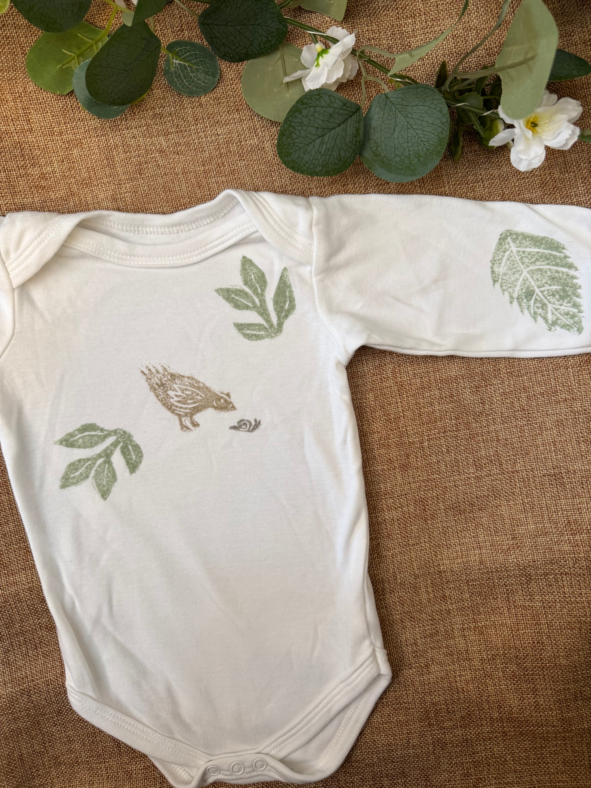 Curious Chicken- hand printed baby grow